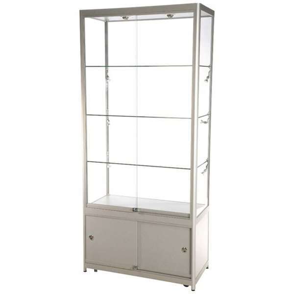 Vitrine glasskab - Showcase Tower Duo glasmontre med underskab, LED lys og lås - sølv