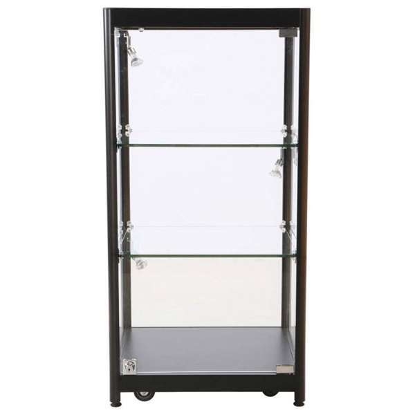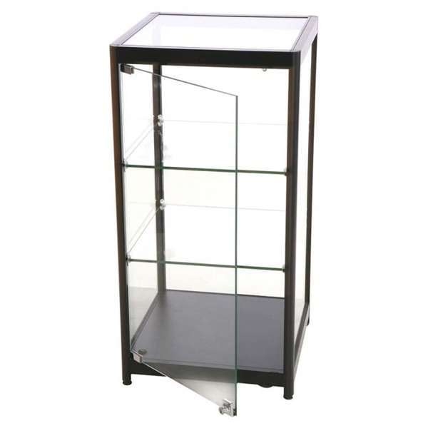 Sort anodiseret vitrinedisk med 2 glashylder.