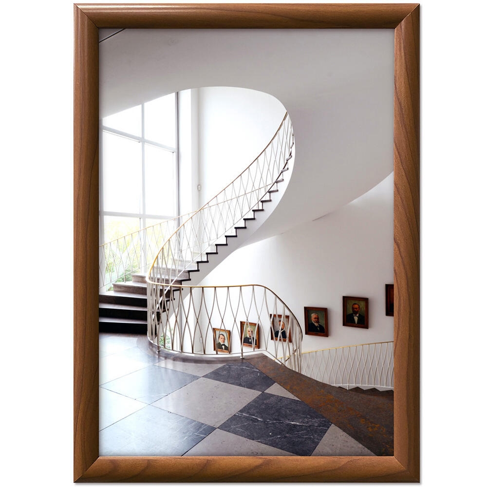 A1 klapramme i med 25 mm alu-profiler med printet, brunt trælook. Hjørner i gering. Hvid PS bagplade samt APET antirefleks frontplade.